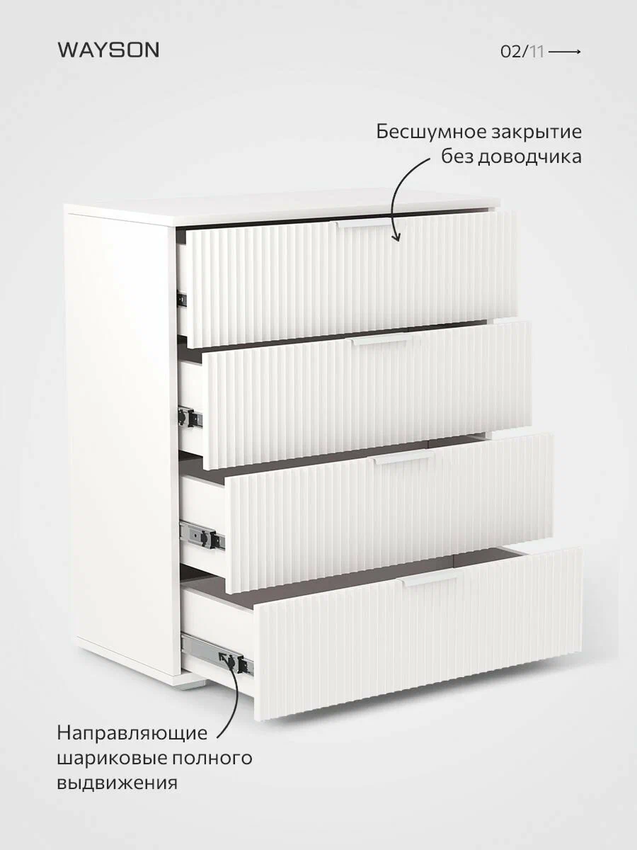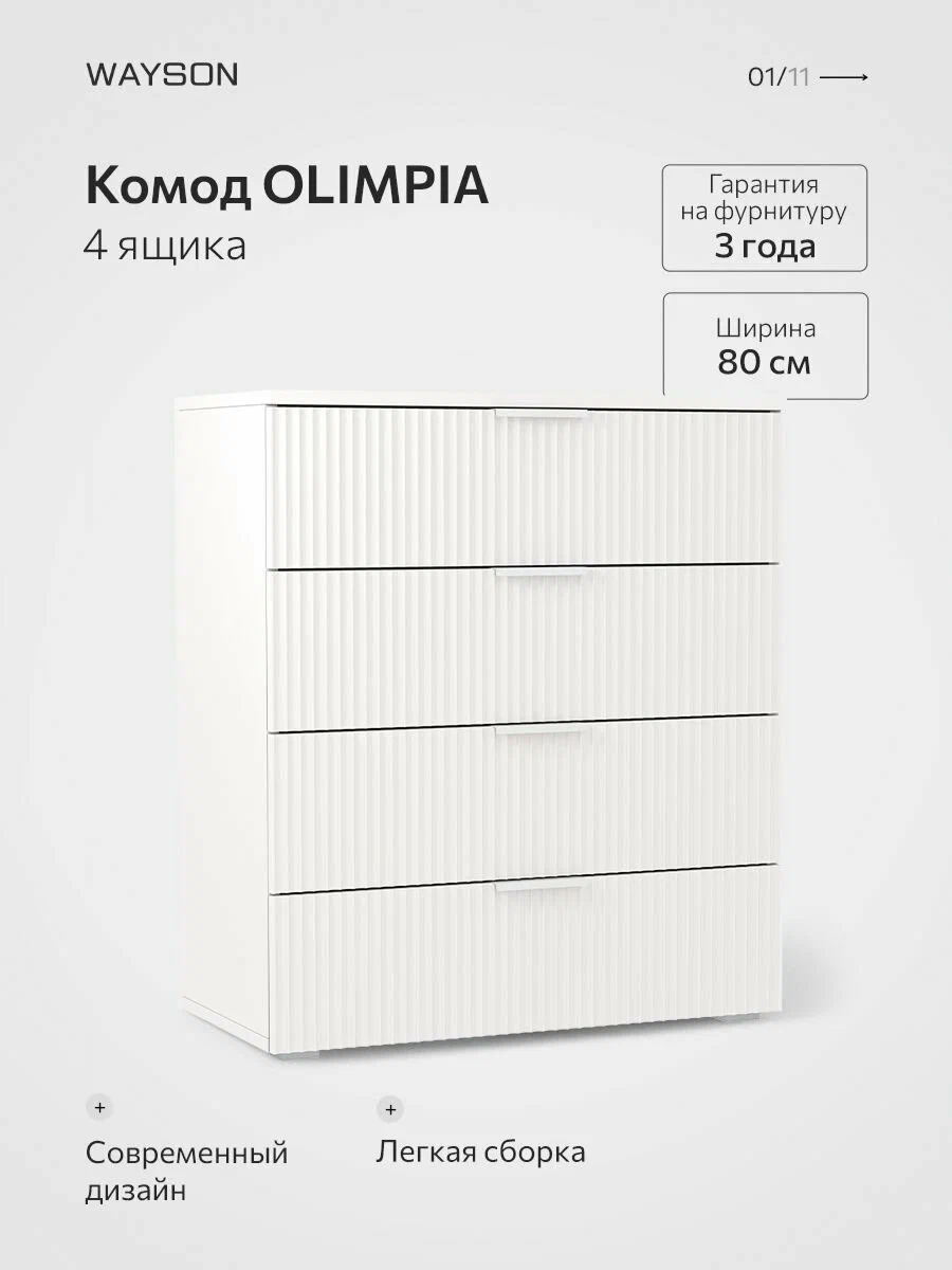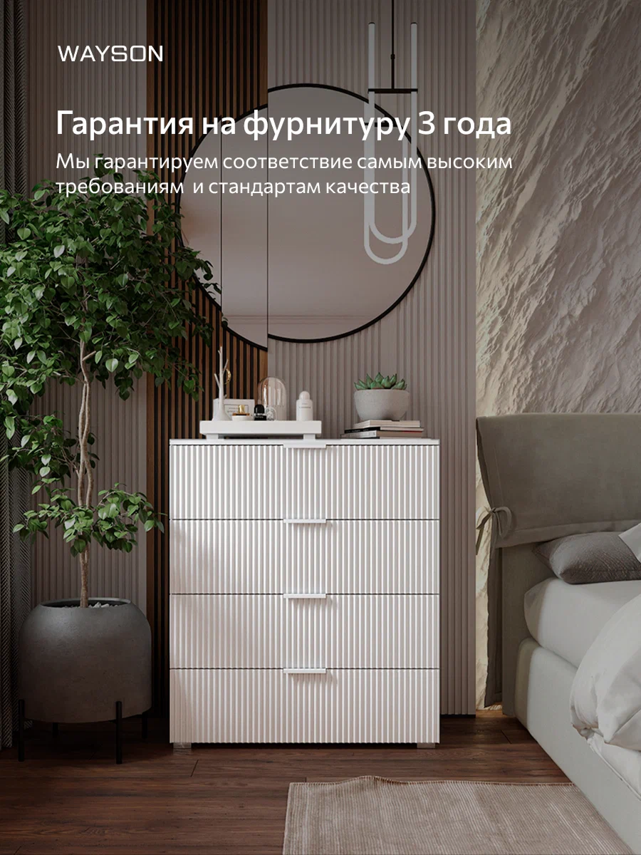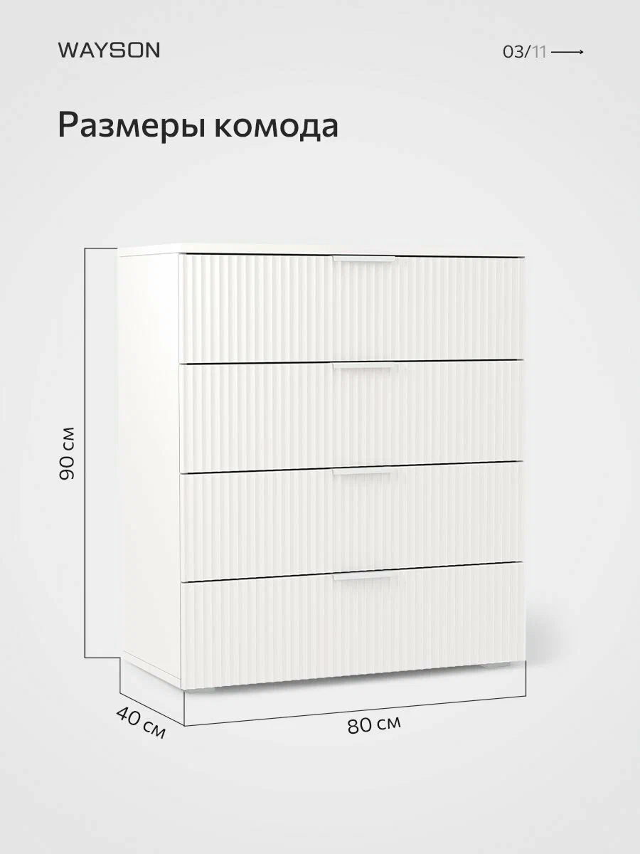 Стильный комод WAYSON "Олимпия" с 4 вместительными ящиками идеально впишется в любой интерьер. Изготовлен из качественного ЛДСП с декоративной фрезеровкой. Универсальный скандинавский дизайн подойдет для спальни, гостиной или прихожей. Практичное решение для хранения вещей.