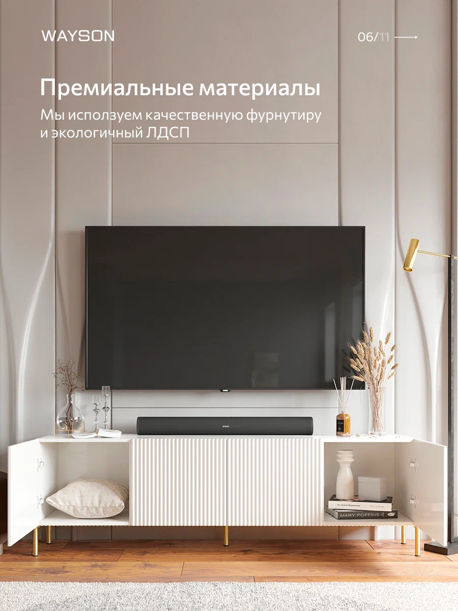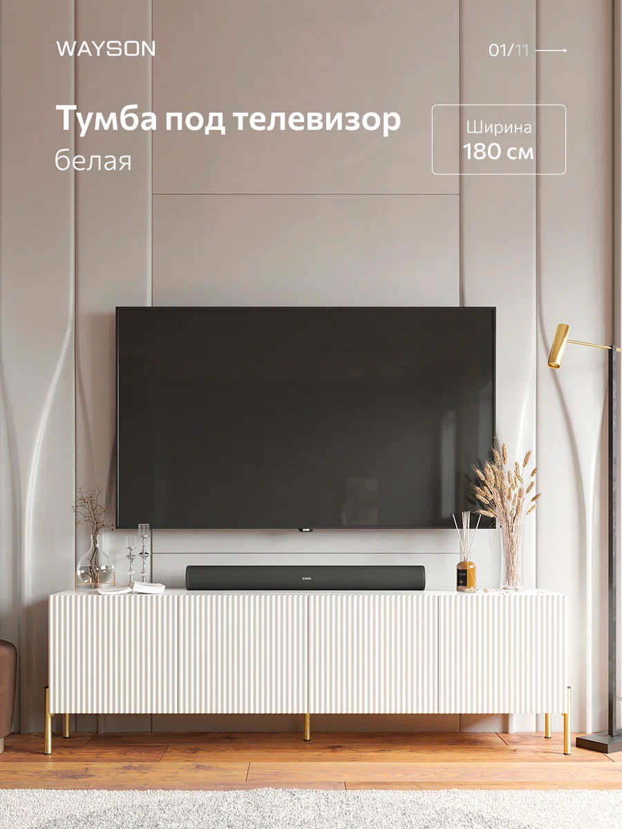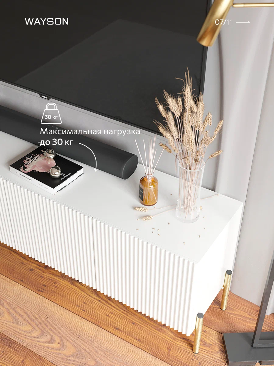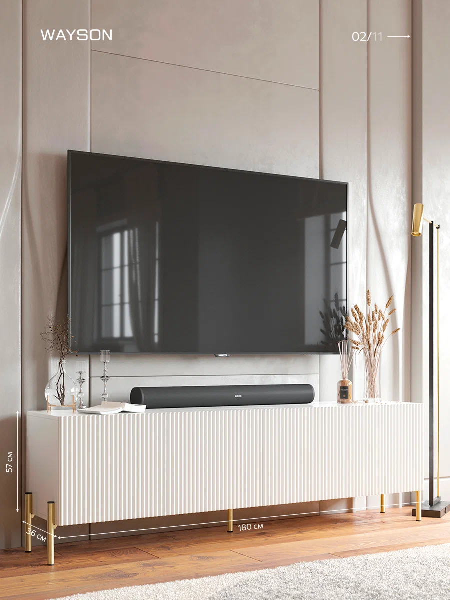 Тумба под телевизор бренда WAYSON белого цвета: современный стиль и функциональность Создайте уютную атмосферу в вашем доме с этой стильной подвесной тумбой под телевизор белого цвета. С размерами 180х57х36 см, она отлично впишется в любой интерьер, придавая пространству элегантность и современный вид. Изготовлена из качественных материалов, консоль имеет прочный корпус из ЛДСП толщиной 16 мм и фасад из МДФ, который покрыт пленкой. Это обеспечивает не только долговечность, но и легкость в уходе за поверхностью, позволяя сохранять идеальный вид на протяжении долгого времени. Изящная отделка фасада с фрезеровкой по образцу добавляет оригинальности и шарма, а современная система ручек Push Open позволяет легко открывать ящики, не нарушая минималистичный стиль. Шариковые направляющие с неполным выдвижением гарантируют плавное и тихое открытие ящиков, что делает использование консоли приятным и комфортным. Усиленные навесы для крепления к стене обеспечивают надежность и безопасность установки, позволяя максимально эффективно использовать пространство. Консоль станет прекрасным местом для размещения вашего телевизора, а также для хранения аксессуаров и мелочей. Добавьте изысканность и стиль в ваш дом с помощью консоли под телевизор, которая объединяет в себе функциональность и современный дизайн. Заказывайте сейчас и наслаждайтесь комфортом и элегантностью в вашем интерьере!