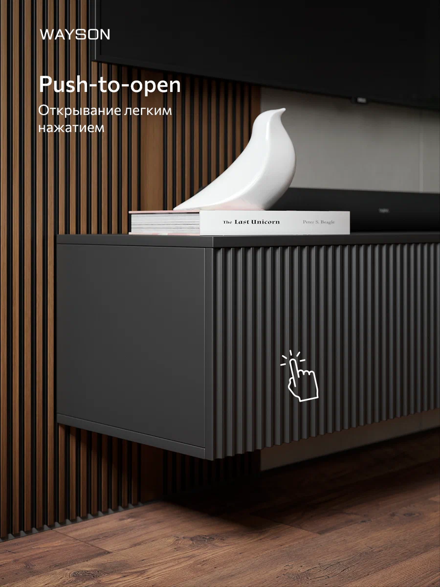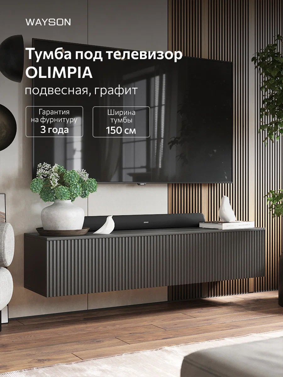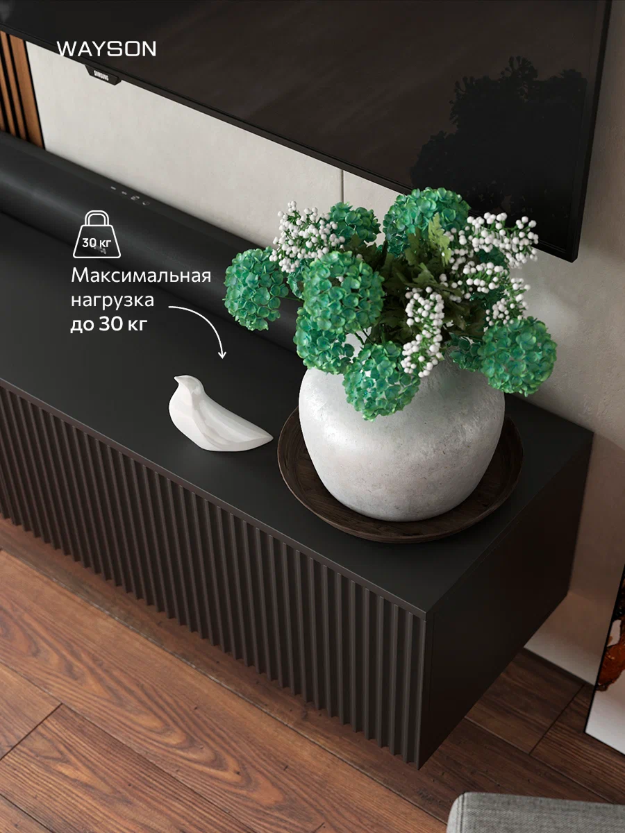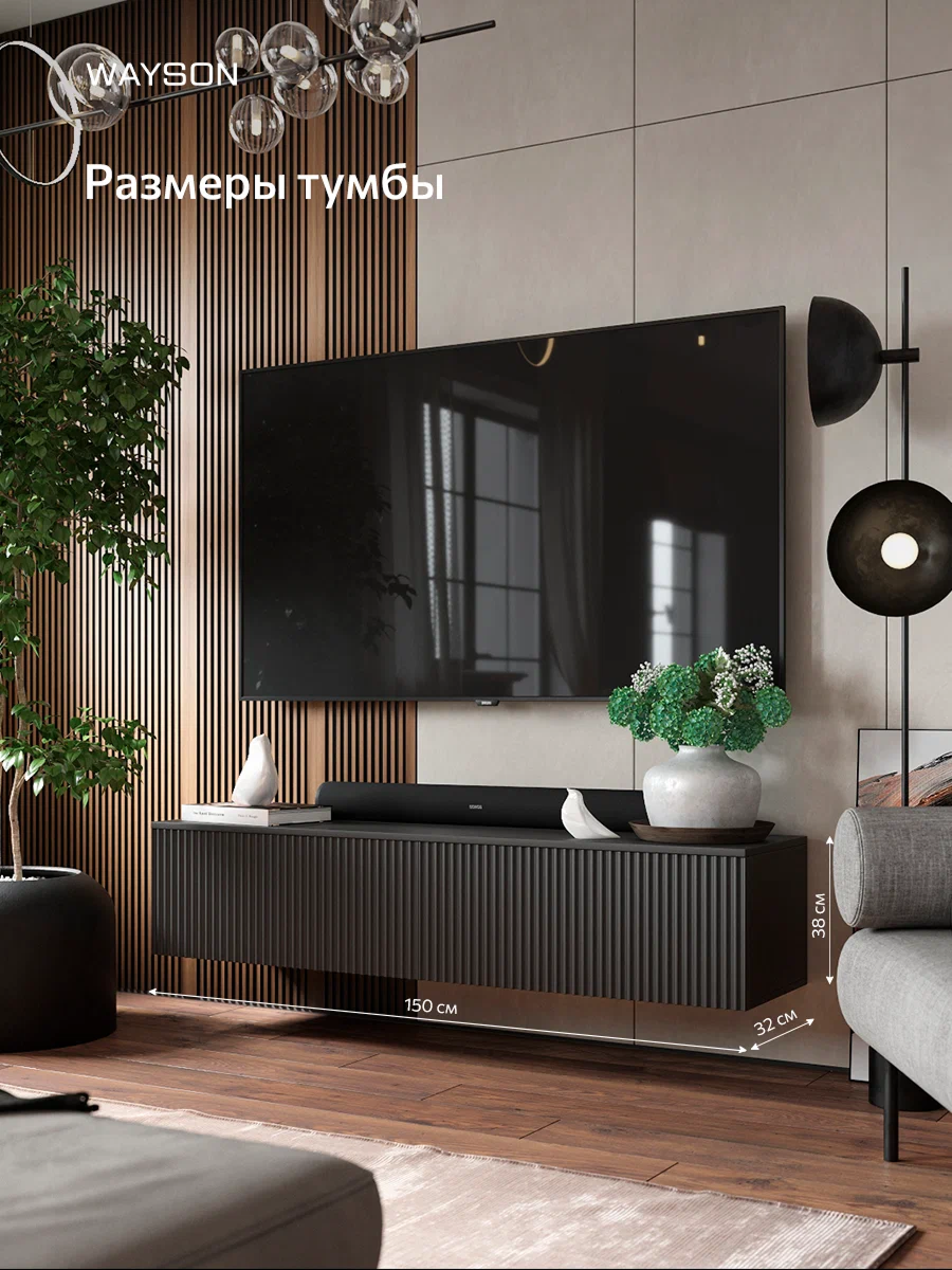 Тумба под телевизор бренда WAYSON цвета графит: современный стиль и функциональность Создайте уютную атмосферу в вашем доме с этой стильной подвесной тумбой под телевизор белого цвета. С размерами 150х32х38 см, она отлично впишется в любой интерьер, придавая пространству элегантность и современный вид. Изготовлена из качественных материалов, консоль имеет прочный корпус из ЛДСП толщиной 16 мм и фасад из МДФ, который покрыт пленкой. Это обеспечивает не только долговечность, но и легкость в уходе за поверхностью, позволяя сохранять идеальный вид на протяжении долгого времени. Изящная отделка фасада с фрезеровкой по образцу добавляет оригинальности и шарма, а современная система ручек Push Open позволяет легко открывать ящики, не нарушая минималистичный стиль. Тонкие торцевые ручки мебельные размером 128-140 мм в цвете белый гармонично дополняют общий дизайн. Конструкция оснащена опорами высотой 15-20 мм, что придает консоли легкость и визуально приподнимает ее над полом. Шариковые направляющие с неполным выдвижением гарантируют плавное и тихое открытие ящиков, что делает использование консоли приятным и комфортным. Усиленные навесы для крепления к стене обеспечивают надежность и безопасность установки, позволяя максимально эффективно использовать пространство. Консоль станет прекрасным местом для размещения вашего телевизора, а также для хранения аксессуаров и мелочей. Добавьте изысканность и стиль в ваш дом с помощью консоли под телевизор, которая объединяет в себе функциональность и современный дизайн. Заказывайте сейчас и наслаждайтесь комфортом и элегантностью в вашем интерьере!